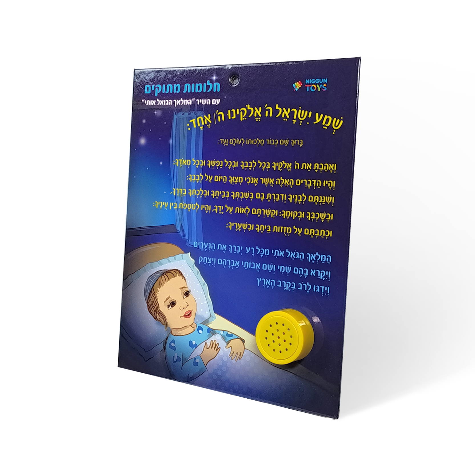 בלחיצה פשוטה, הלוח משמיע את מנגינת “המלאך הגואל אותי” – תפילה שהורים רבים שרים לילדיהם לפני השינה במשך דורות. המנגינה רכה, נעימה ועמוקה, ויוצרת אווירה שמשרה ביטחון ושקט.